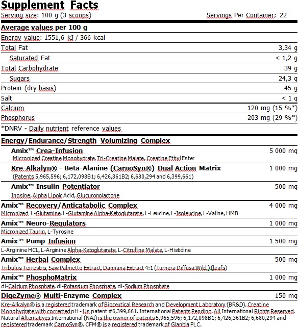 Osnova Anabolic Masster™ je kvalitetana mešavina proteina, ugljenih hidrata i specijalnog paketa koji sadrži visoke vrednosti sledećih sastojaka; kreatin monohidrat, Kre-Alkalin, kreatin etil ester CEE, glutamin, arginin, BCAA.Ukoliko ne želite da gubite vreme tragajući za svim neophodnim proizvodima i efikasnom kombinacijom istih, oslonite se na Anabolic Masster™ . Ove perfektan „ALL-IN-ONE“ proizvod kombinuje izuzetno efikasne i visoko kvalitetne sirovine. Matriks proteina u ovom proizvodu spaja whey protein koncentrat, hidrolizovani protein iz govedine i dve vrste izolata, CFM izolat i izolat dobijen jonskom razmenom.