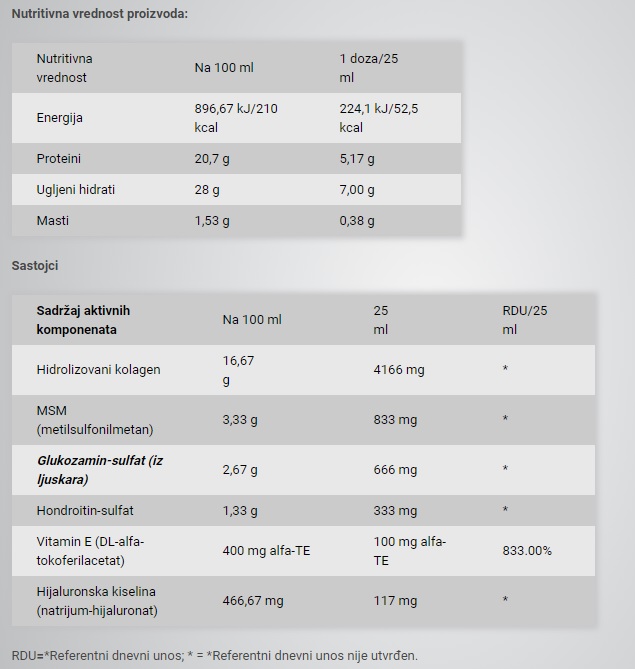 Ostali sastojci: voda, invertni šećerni sirup, hidrolizovani kolagen, MSM (metilsulfonilmetan), Glukozamin-sulfat (iz ljuskara), hondroitin-sulfat, emulgator: polisorbat 80, Vitamin E (DL-alfa-tokoferilacetat), Hijaluronska kiselina (natrijum-hijaluronat), kiselina (limunska kiselina), aroma, konzervans (sorbinska kiselina), boje (beta karoten, beta-apo-8-karotenal);