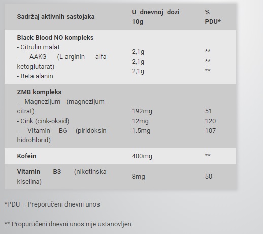 Black Blood je kompleks koji je napravljen sa visokom dozom kofeina i aktivnim sastojcima koji će doprineti produkciji nitrogen monoksida i karnozina. Magnezijum, niacin i vitamin B6 doprinose normalizaciji energetskog balansa i metaboličkih procesa, a ujedno eliminisu stres i umor. Vitamin B6 doprinosi normalnoj proteinskoj sintezi kao i sintezi glikogena. Magnezijum doprinosi normalnoj funkciji mišića, cink metabolizmu i oksidaciji masti, kao i sintezi proteina, te podizanju testosterona u krvi.