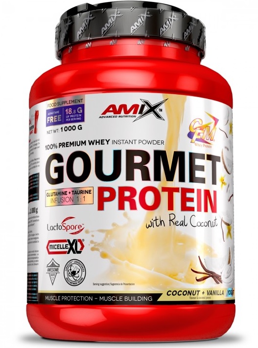 Amix™ Gourmet Protein sa delićima pravog voća ili kokosa – novi proteinski proizvod dizajniran i razvijen od strane stručnjaka Amix tima. Njegovu moćnu formulu čine CFM® whey protein izolat, whey protein koncentrat i micelarni kazein sa dodatim L-Glutaminom, taurinom i probiotičkim LactoSpore®.