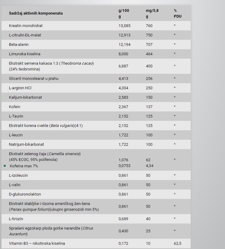 Kreatin, već dobro poznat proizvod koji ostaje i dalje jedan od najboljih ali i najčešće testiranih preparata na tržištu, je tu da poveća fizičke performanse, a posebno je svojstven za kratkotrajne, eksplozivne aktivnosti. Osim toga dokazano je da utiče na povećanje mišićne snage i mase. Kofein i zeleni čaj kao neizostavni sastojci za održanje budnosti i mentalnog fokusa, dok niacin doprinosi normalnom metabolizmu a u kombinaciji sa folnom kiselinom pomaže u sprečavanju zamora. Sve je formulisano za postizanje vrhunskih rezultata!