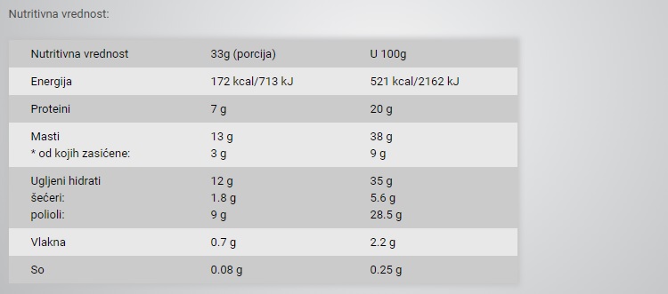 Sastojci: biljno ulje (repičino i palmino ulje), maltitol, koncentrat proteina surutke (20%) (iz mleka), obrano mleko u prahu (8%), kakao u prahu sa niskim sadržajem masnoće, emulgator: lecitin iz suncokreta, prirodna aroma vanile.