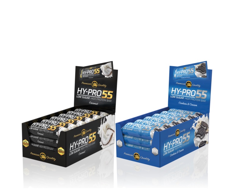 Hi-Pro 55 Bar sa niskim sadržajem šećera sa oko 20 g proteina i maksimalno 2,7 g šećera. Svaka štanglica je prekrivena punomasnim mlekom ili belom čokoladom, različitog ukusa.