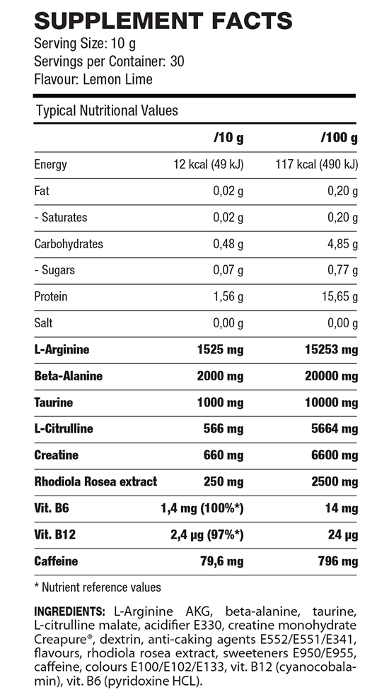 L-citrulin - prekursor aminokiseline l-arginin. Stoga naglašava efekte l-arginina koji je već prisutan u ovoj pre-workout formuuli i donosi pravi potsticaj vašem treningu.