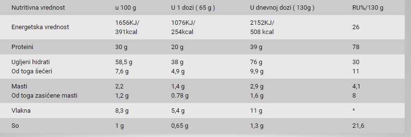 Informacija o alergenima: Sadrži mleko i soju. Proizvedeno u pogonu u kome se prerađuju mleko, jaja, gluten, soja, ljuskari, sumpor-dioksid i jezgrasto voće.