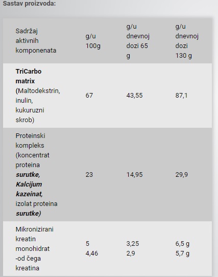 Sastojci: TriCarbo matrix (Maltodekstrin, inulin, kukuruzni skrob); Proteinski kompleks (koncentrat proteina surutke, Kalcijum kazeinat, izolat proteina surutke); mikronizovani kreatin monohidrat; zgušćivač: natrijum karboksimetil celuloza; aroma; emulgator: soja-lecitin; so; zaslađivač: sukraloza; boja: tartrazin*