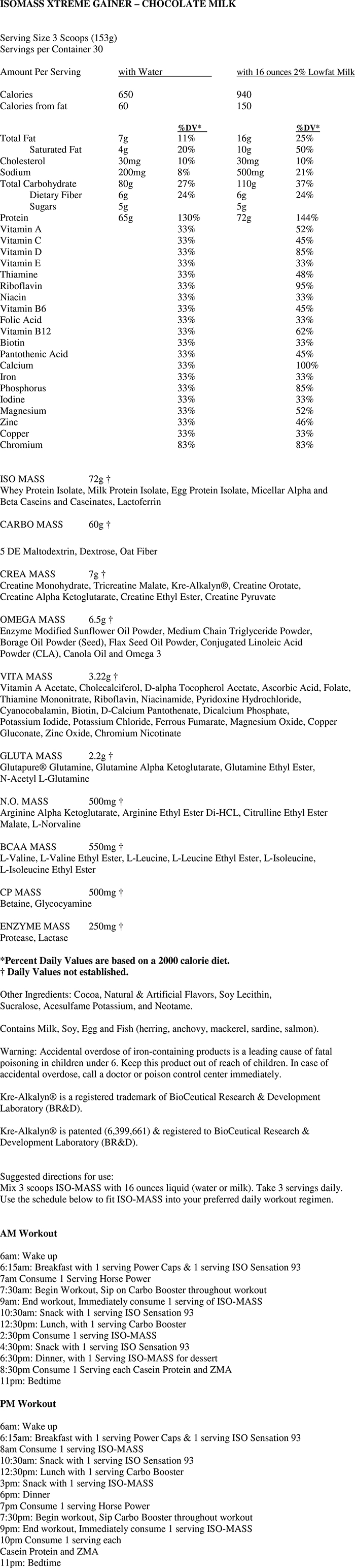 Svaka doza sadrži i 4 naprednih oblika glutamina, 7 naprednih oblika kreatina, kao i kompleks zdravih masti (omega 3, CLA, i MCT) za bolje zdravlje, proizvodnju hormona i sagorevanje masti. Sada konačno možete unositi više kvalitetnih kalorija, a da budete sigurni da ćete dobiti samo čisto mišićno tkivo. Ovaj neverovatni proizvod sadrži i NO prekursore, enzime, vitamine, minerale i antioksidante...Ukratko, Iso Mass Xtreme Gainer daje mnogo više nego što ste ikada mogli očekivati da ćete naći u jednom gejneru!