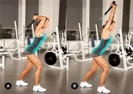 Akcija: Ispružite ruke da podignete šipku iznad vašeg tela, sve dok vam ruke ne budu prave. Izdržite nekoliko sekundi, pa lagano se vratite na početak. Kada uradite set vežbi, vratite šipku u postolje (B).
