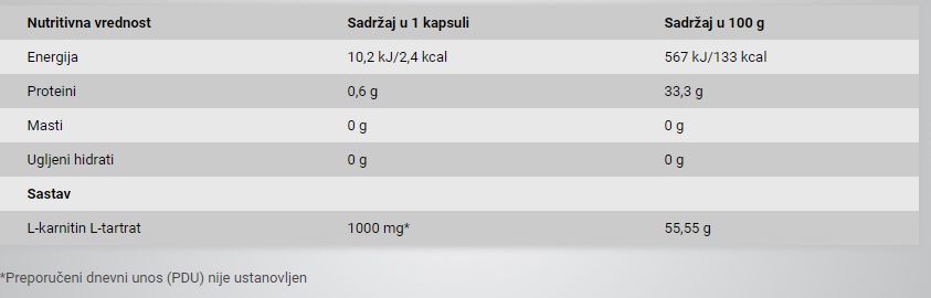 Sastav: L-karnitin L-tartrat, sredstvo za povećanje zapremine: mikrokristalna celuloza; omotač [stabilizator: polivinil alkohol, polietilen glikol; boja: titan-dioksid; sredstvo protiv zgrudvavanja: talk, mono- i digliceridi masnih kiselina]; sredstva protiv zgrudvavanja: magnezijumove soli masnih kiselina, silicijum-dioksid.