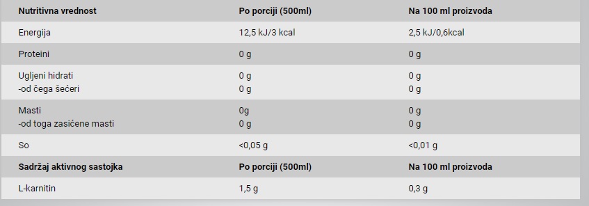 Sastojci: voda, L-karnitin (300mg/100ml), regulator kiselosti: limunska kiselina, arome, konzervansi: kalijum sorbat, natrijum benzoat, zaslađivač: sukraloza