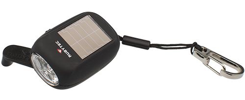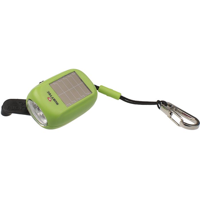 Džepna lampa na dve diode, koja se napaja preko sunčanih ćelija ili dinama. Omča za metalni karabiner.