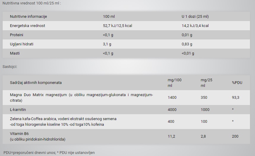 Preporučena upotreba: 1 ampula tečnosti (25 ml) dnevno, tokom treninga.