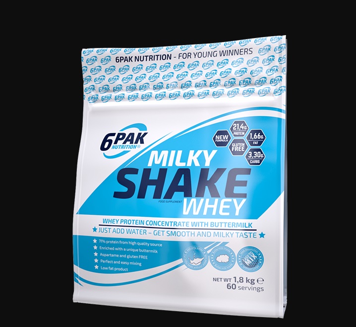 6PAK Milky Shake Whey je nutritivni proteinski šejk stvoren kako bi sportistima osigurao unos preko potrebnih proteina putem nove, poboljšane formule obogaćene posebnim sastojkom – mlaćenicom* (buttermilk). Ukupno 71% proteina izdvojeno je iz whey protein koncentrata (WPC), a dodatak aminokiselina razgranatog lanca BCAA utiče na oporavak mišića posle vežbanja i proces izgradnje mišića, štiteći ih pritom od razgradnje (katabolizma).