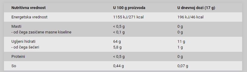 Način primene: Rastvoriti jednu dozu (17 g) u 250 ml hladne tečnosti u šejker boci. Konzumirati jednu dozu 30 minuta pre treninga. Pripremiti neposredno pre konzumiranja!