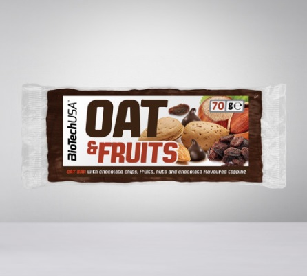 Oat & Fruits bar je energetska štanglica sa ovsenim pahuljicama i pravim komadićima voća u svom sastavu. Zahvaljujući svom sadržaju, Oat & Fruits Bar je niskog glikemijskog indeksa i obezbeđuje sporo apsorbujuće ugljene hidrate za postepeni energetski priliv. Sačinjen je od 56% ugljenih hidrata, 6% proteina i 26% masti. S obzirom na to da sadrži veliku količinu ovsenih pahuljica, Oat & Fruits bar je bogat vlaknima, vitaminima, mineralima i antioksidantima.