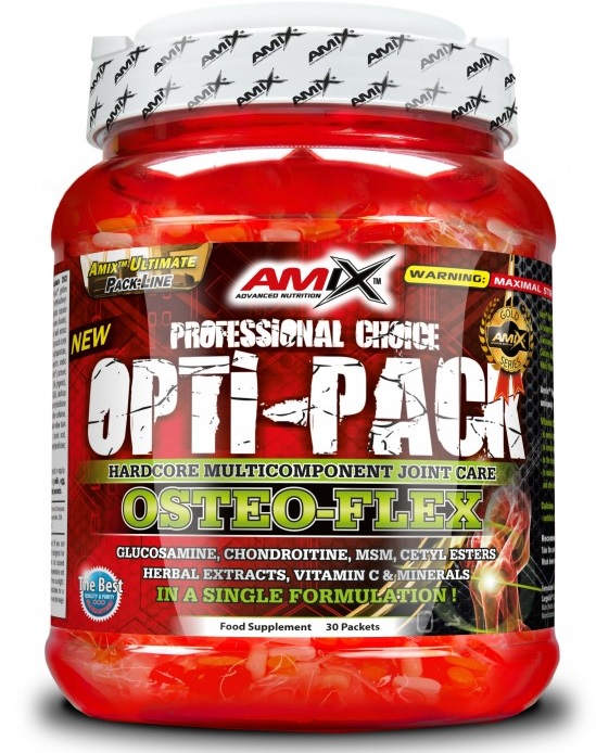 Amix Opti-Pack Osteo-Flex je kompletan proizvod za zaštitu zglobova, tetiva i kostiju, specijalno dizajniran za sportiste sa najvećim potrebama. Osteo-Flex sadrži velike doze glukozamina, hondroitina, MSM, UltraGrad lanenog ulja, hijaluronske kiseline, vitamina C, kalcijuma, magnezijuma, cinka i brojnih biljnih ekstrakata (tamjan, đumbir, šipurak, kora bele vrbe).