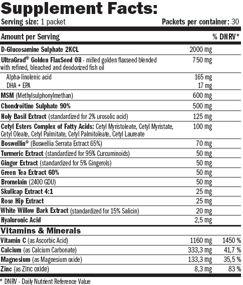 Dijetetski proizvod: podrška za zglobove, kosti i tetiveKoličina: 30kesica (30doza)Jedna doza (1 kesica) sadrži:Glukozamin sulfat 2KCL 2.000mgUltraGrad® Ulje lanenog semena 750mgALA 165mgDHA+EPA 17mgHodroitin sulfat 90% 500mgMSM 600mgEkstrakt bosiljka (stand. na 2% urzolinske kiseline) 125mgCetil Ester kompleks masnih kiselina 100mgBoswellia Serrata ekstrakt 65% 70mgKurkuma ekstrakt (stand. na 95% kurkuminoida) 50mgEkstrakt đumbira 50mgEkstrakt zelenog čaja 50mgBromelain 50mgEkstrakt biljke Skullcap 4:1 25mgEkstrakt šipka 25mgEkstrakt kore bele vrbe(stan. 15% Salicin) 20mgHijaluronska kiselina 2,5mgVitamin C 1.160mgKalcijum 333,3mgMagnezijum 133,3mgCink 8,3mgUpotreba: sadržaj 1 kesice konzumirati uzprepodnevni obrok, sa dosta vode.UPOZORENJE: Ne uzimati više od preporučene doze. Ne preporučuje se mlađim od 18 godina, trudnicama ili dojiljama. Čuvati van domašaja dece. Alergen upozorenje: u proizvodnom pogonu se proizvode i proizvodi koji sadrže mleko, jaja, soju i ljuskare.Čuvanje: na suvom i hladnom mestu (ne u frižideru).Uvoznik i distributer: FITCO d.o.o. Novi Sad, Ive Ćipika 18.Poreklo: EUProizvedeno za: LargeLife® Ltd., Bexley square, Salford, Manchester, M3 6BZ, Velika BritanijaRok upotrebe do vremena naznačenog na bočici.Odobrilo Ministarstvo zdravlja Republike SrbijeRegistracioni broj: 4108/2013 od 02.10.2013.