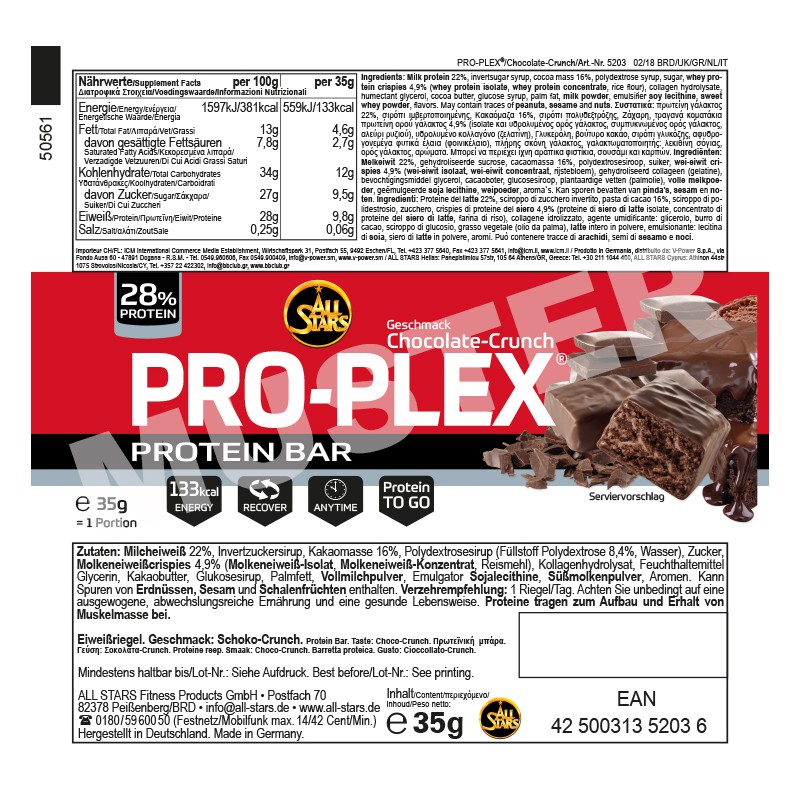 Pro Plex Bar se sastoji iz dva visoko kvalitetna izvora proteina (proteina iz mleka i surutke), zatim iz brzo i sporo absorbujućih ugljenih hidrata i masti biljnog porekla, sve ovo u kombinaciji sa Lecitinom (prirodnim emulgatorom masti).
