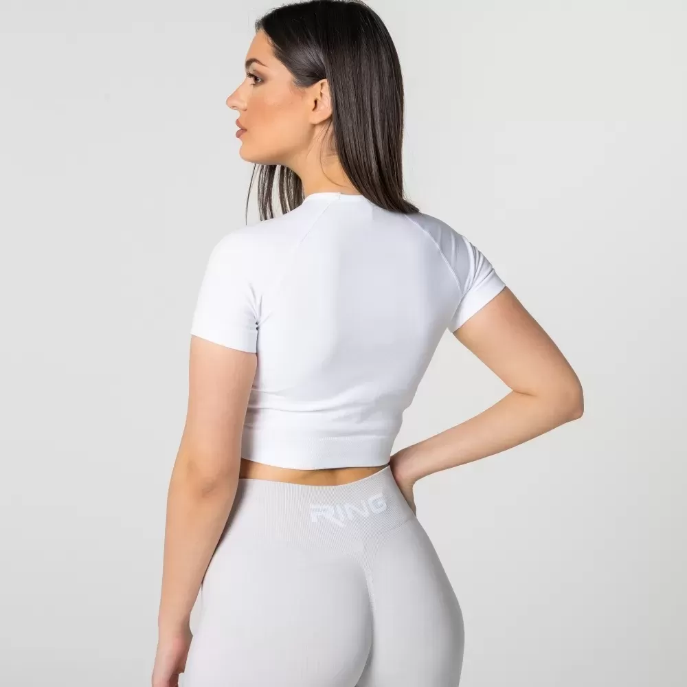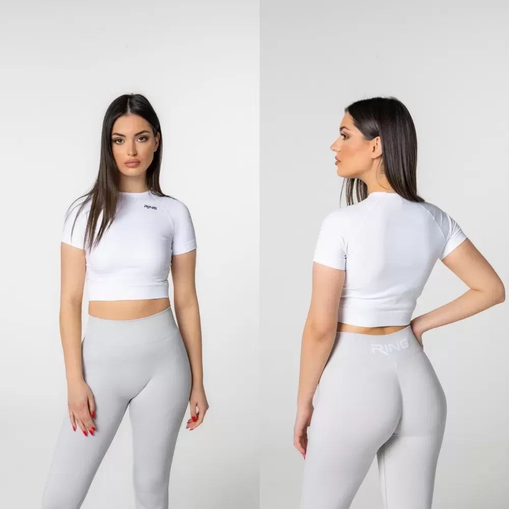 RING Active crop top je moderna sportska majica srednje dužine sa kratkim rukavima, dizajnirana za maksimalnu udobnost i slobodu pokreta tokom treninga i svakodnevnih aktivnosti. Zahvaljujući zatvorenijem, minimalističkom dizajnu, pruža osećaj sigurnosti i stabilnosti, dok istovremeno zadržava moderan sportski izgled.
