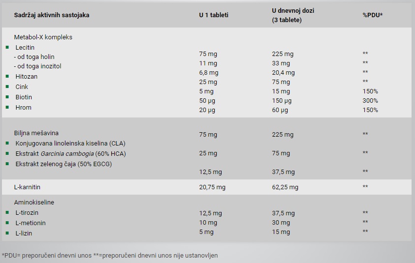 Sastojci: zgušnjivači: hidroksipropilmetilceluloza, celulozni gel; lecitin (soja); konjugovana linolna kiselina; omotač: hidroksipropilmetilceluloza, boja: titanijum-dioksid; hitozan; suvi ekstrakt egzokarpa ploda garsinije (Garcinia cambogia) standardizovan na 60% hidroksilimunske kiseline; suvi ekstrakt lista zelenog čaja (Camellia sinensis) standardizovan na min. 85% polifenola I 50% EGCG; L-tirozin; L-metionin; sredstva protiv zgrudvavanja: magnezijumove soli masnih kiselina, silicijum-dioksid; L-karnitin-L-tartarat; L-karnitin-hidrohlorid; L-karnitin; cink-glukonat; L-lizin; hrom-pikolinat; biotin.