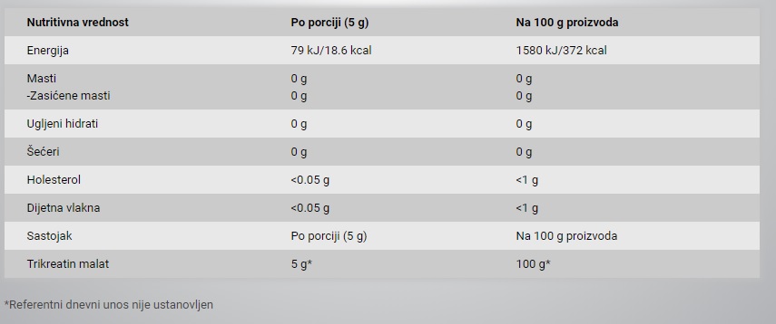 Kreatin je najbolji bez-kalorijski suplement koji ima pozitivan uticaj na ćelijsku masu, obnavljanje ATPa, snagu i dobijanje na mišićnoj masi. Trikreatin malat se sastoji iz tri molekula kratina koji su hemijski vezani za molekul malične kiseline. Na taj način je stvoren novi i efikasniji kreatin. Malična kiselina kao međuproizvod u Krebsovom ciklusu pomaže u obnovi energije.