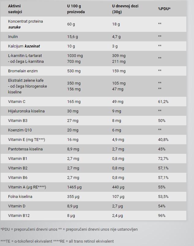 Sastojci: Koncentrat proteina surutke; inulin; kalcijum kazeinat (iz mleka); maltodekstrin; ugušćivač: natrijum karboksimetilceluloza; aroma vanile, L-karnitin-L-tartarat; emulgator: sojin lecitin; bromelain enzim u prahu 1200 GDU/g; kalcijumova so ortofosforne kiseline; ekstrakt semena zelene kafe, Coffea robusta (10:1); kukuruzni skrob; zaslađivač: sukraloza; so; magnezijum oksid; L-askorbinska kiselina; DL-alfa-tokoferil-acetat; hijaluronska kiselina; nikotinamid; koenzim Q10; retinil acetat; D-kalcijum pantotenat; boja: tartrazin; holekalciferol; tiamin mononitrat; piridoksin hidrohlorid; riboflavin; pteroilmonoglutaminska kiselina; D-biotin; cijanokobalamin.