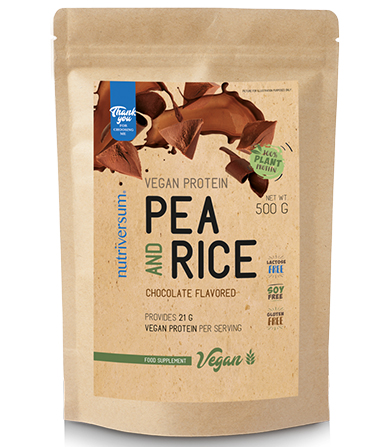 Kompleks proteina pirinča i graškaEuropean Food Safety Agency (EFSA) i European Commission (EC)). Rice and Pea Complex Protein predstavlja: - 100% biljni proteinski izvor - visok sadržaj proteina (22 g) - ne sadrži laktozu - ne sadrži surutku - veganska formula - visok sadržaj biljnih vlakana - praktično pakovanje Rice and Pea Complex Protein se lako priprema i može se nabaviti u dva ukusa: čokolada i vanila. Preporučeno doziranje i način upotrebe Pomešati 1 dozu (30 g praška) sa 250 ml hladne vode. Napitak koristiti jednom dnevno i to: u danima treninga, napitak uzimati do 30 minuta posle treninga, u danima kada nema treninga, napitak popiti odmah nakon buđenja.
