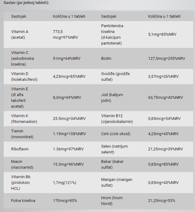 Ostali sastojci: Kalcijumova so ortofosforne kiseline; zgušnjivač: kalijum-sulfat; kapsula [želatin, voda, boje: titan-dioksid, gvožđe oksidi i hidroksidi;]; magnezijum-oksid; L-askorbinska kiselina; DL-alfa tokoferol-acetat; agensi protiv zgrušavagvožđe-sulfat; retinil-acetat; D-kalcijum pantotenat; cink-oksid; bakar-sulfat; mangan-sulfat; piridoksin-hidrohlorid; holkalciferol; tiamin-mononitrat; riboflavin; pteroilmonoglutaminska kiselina; d-biotin; hrom(III)hlorid; Kalijum-jodid; natrijum-selenit; fitomenadion; cijanokobalamin;