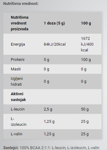 Sastojci: 100% BCAA 2:1:1: L-leucin, L-izoleucin, L-valin