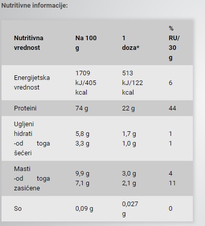 Sastojci: koncentrat proteina surutke (mleko); kakao u prahu sa niskim sadržajem masnoće; pojačivač arome - glicin; emulgatori – lecitin iz soje, natrijum-karboksimetilceluloza; arome; biljna ulja – trigliceridi srednjeg lanca (MCT) iz kokosovog ulja; kuhinjska so; vanila kristal; zaslađivač – sukraloza.