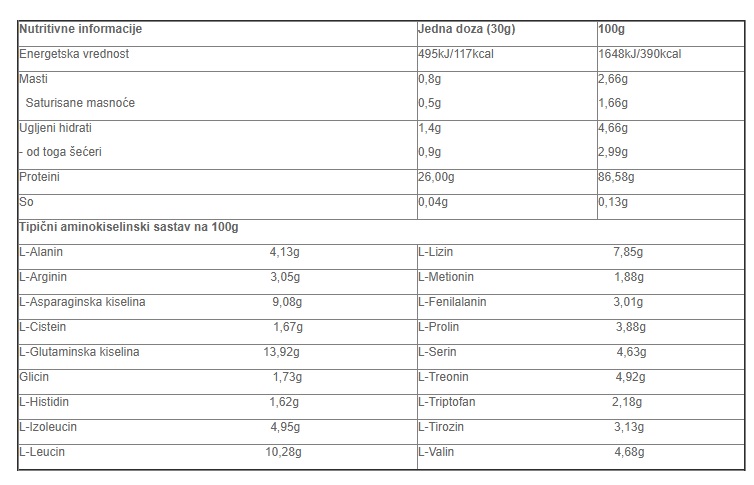 Prednosti:– 85% proteina u svakoj porciji– whey protein izolat sa visokim anaboličkim efektom– visoka vrednost BCAA– brza ugradnja– nizak nivo masnoća i bez aspartama.